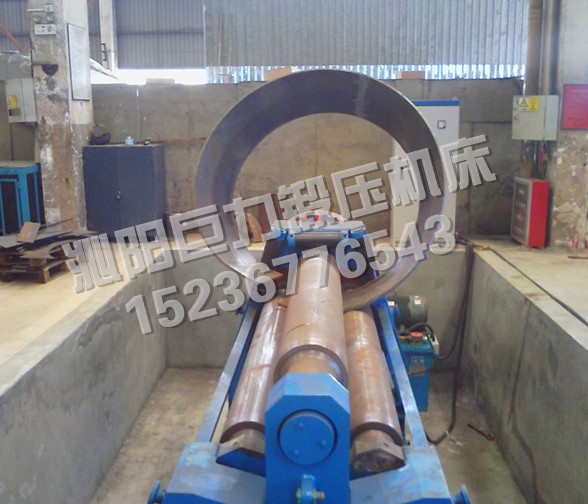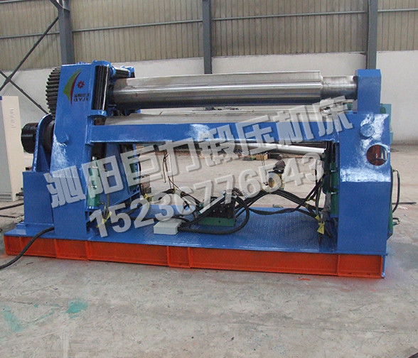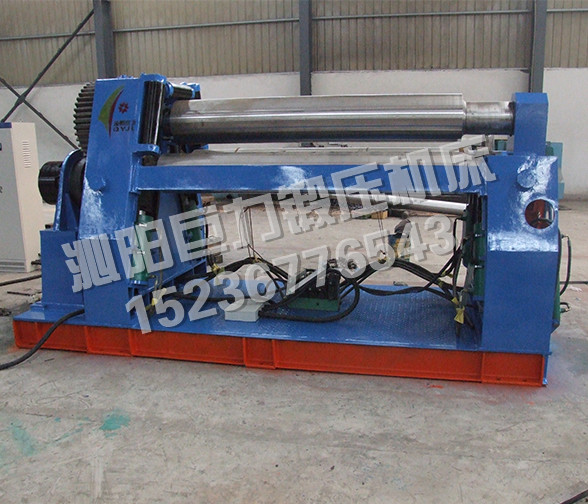 該機型的上輥固定,兩下輥呈傾斜狀做旋轉(zhuǎn)運動,兩下輥可以同時升降,也可以單升單降,用以完成板材的端部預彎。