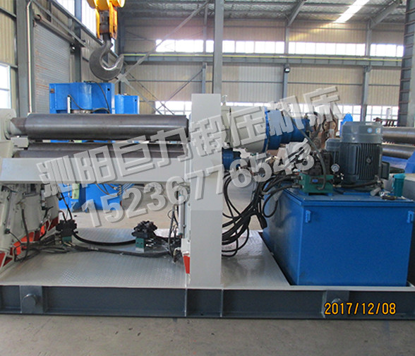 該四輥卷板機(jī)與對(duì)稱三輥卷板機(jī)比較,它可以不借助其它設(shè)備模具,直接予彎板材端部,而且剩余直邊較?。凰梢圆皇拱宀恼{(diào)頭,而卷成工件。