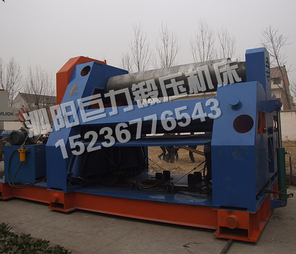 該四輥卷板機(jī)與對(duì)稱(chēng)三輥卷板機(jī)比較,它可以不借助其它設(shè)備模具,直接予彎板材端部,而且剩余直邊較小;它可以不使板材調(diào)頭,而卷成工件。